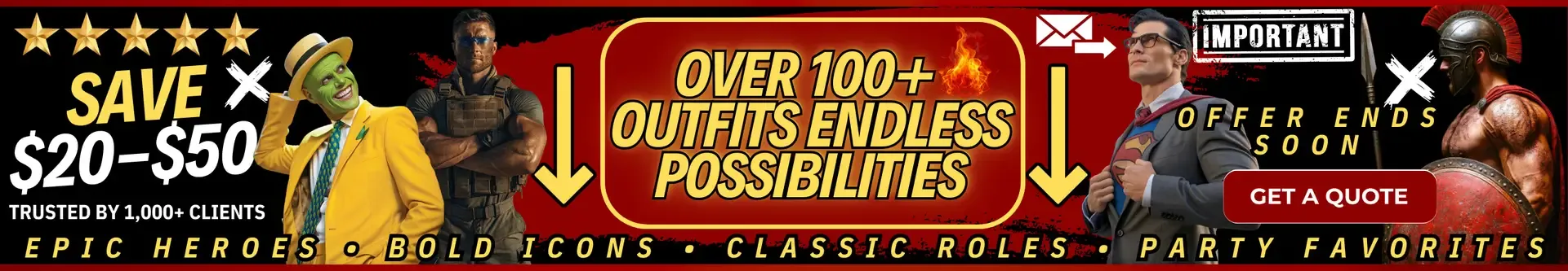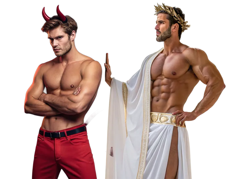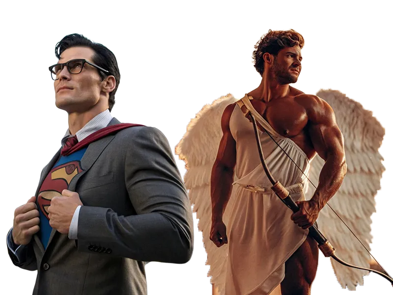 😇 Angel – Ángel | 😈 Devil – Diablo | ⚔️ Gladiator – Gladiador | 🏛️ Greek God – Dios Griego | 🦸♂️ Hercules / Spartan Warrior – Hércules / Guerrero Espartano | 🕶️ Clark Kent – Clark Kent / Superman | 🧞 Genie / Aladdin Theme – Genio / Aladino